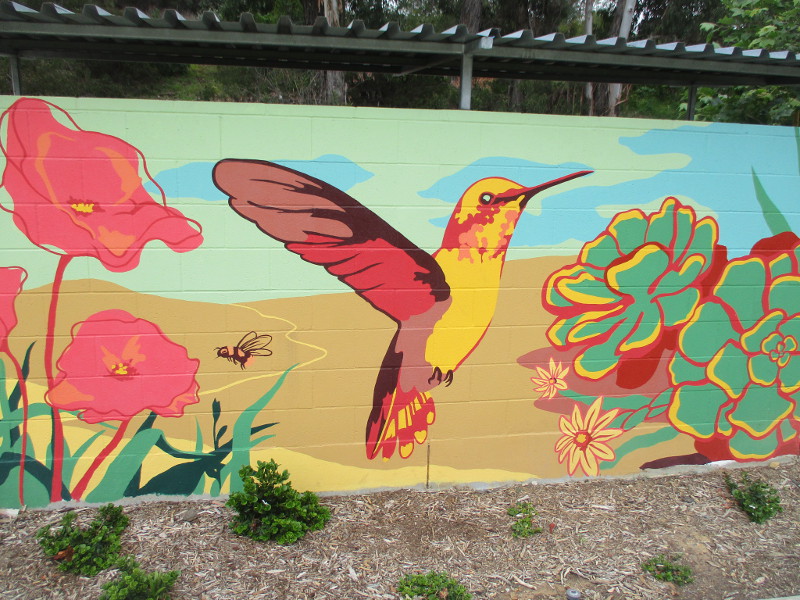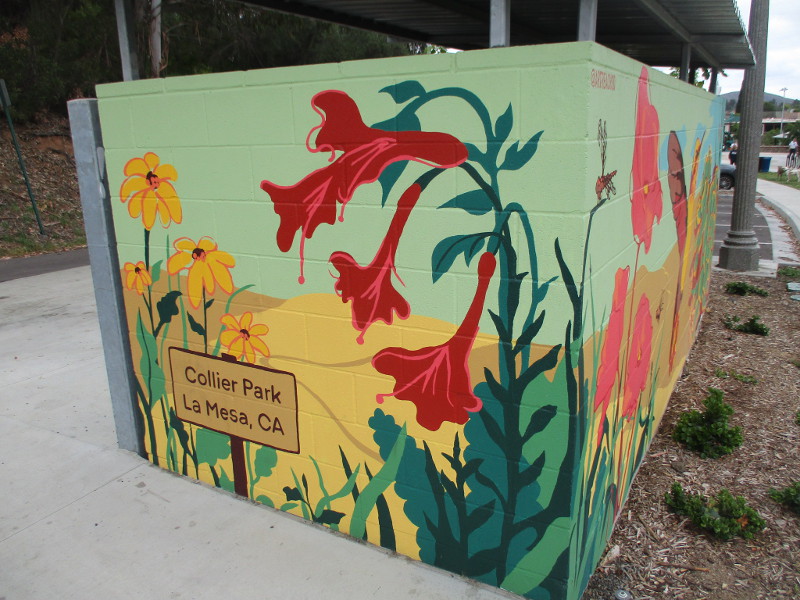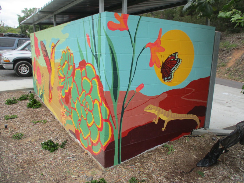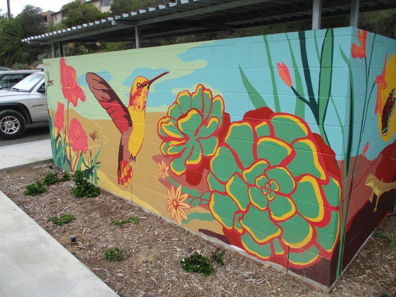 This beautiful mural decorates the trash enclosure at Collier Park in La Mesa. I was told by a friendly gentleman at the La Mesa Community Center that the art was painted not too long ago.