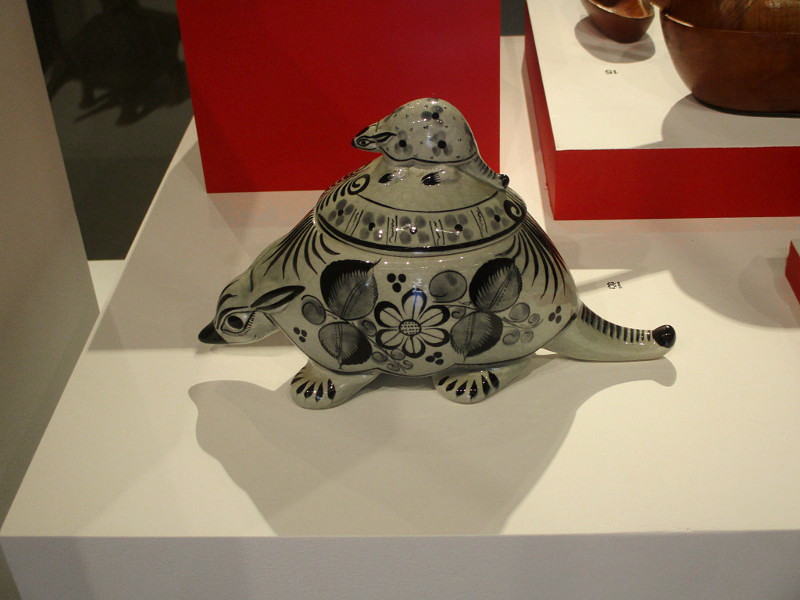 The exhibition includes folk art armadillos crafted from wood, clay, glass, metal, stone, fiber and various natural materials such at shells, gourds and coconuts. There are bowl armadillos, toy armadillos, ashtray armadillos, pipe armadillos, jar armadillos, coin bank armadillos, toothpick holder armadillos…