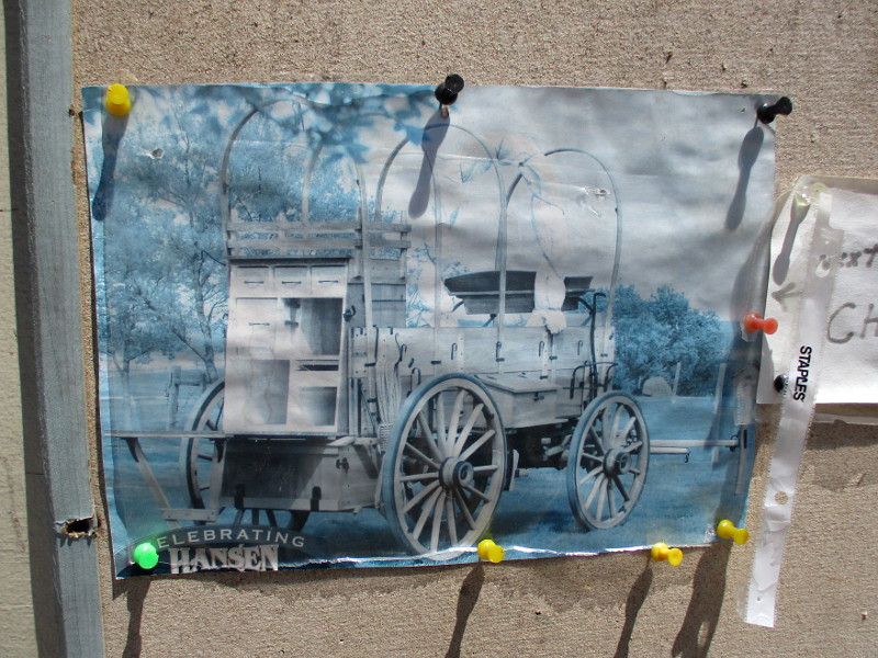 The guys working in Escondido will create a covering for their chuck wagon using duck cloth. You can see how the rear of the old chuck wagon in the photo has compartments used for storing food and cooking materials.