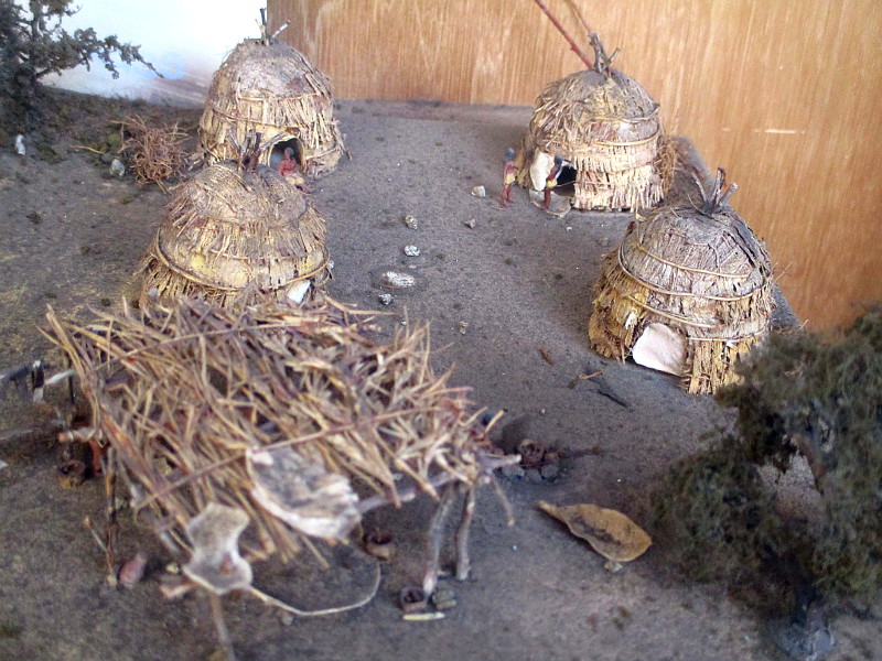 Next, here’s a model of a Kumeyaay village–presumably Kosa’aay which was located nearby on the San Diego River. The native Kumeyaay long predated the arrival of Spanish missionaries and the establishment of Old Town…