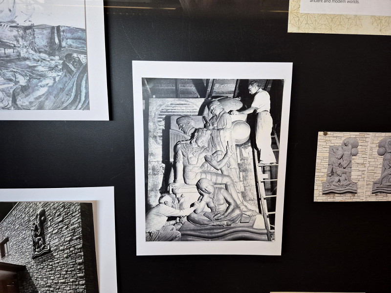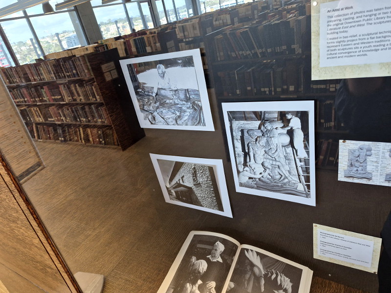 Historical photos concentrate on Hord’s creation of the Literature East and West bas-relief panels, which still exist on the library’s previous, now-vacant building. Photos (such as the one above) show the preparing, casting and hanging of the sculptural panels back in 1953. I blogged about these panels and other art at that old downtown library many years ago. See that past blog post here.