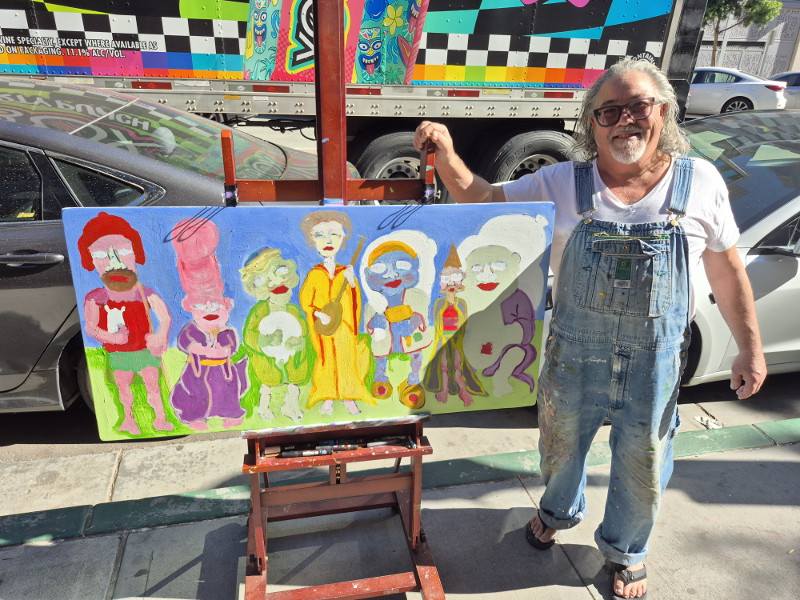 That’s San Diego artist James Watts (@jewattso) in the above photo. He was painting an image of Japan’s Seven Lucky Gods (or Shichifukujin) on the downtown sidewalk outside his studio yesterday. It’s number 93 of the 100 paintings he’s presently working on.