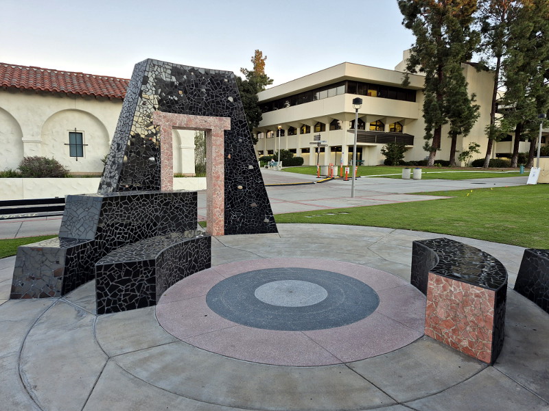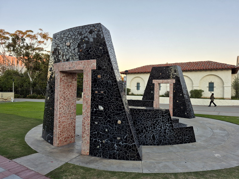 If you’ve ever walked down the campus’ central Campanile Walkway you’ve no doubt seen this unique stone-like sculpture with its two portals. It has an appearance suggestive of ancient temples or ruins.