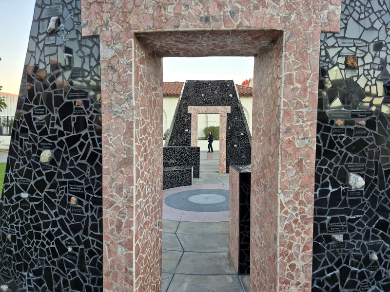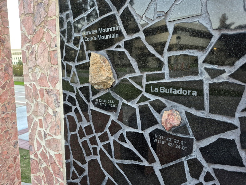 Those who look closely at the monument will see small rock samples embedded in it, with informative labels. The rocks come from locations all around our region, within a hundred miles of SDSU, including places in Mexico. The art blends culture with geology.