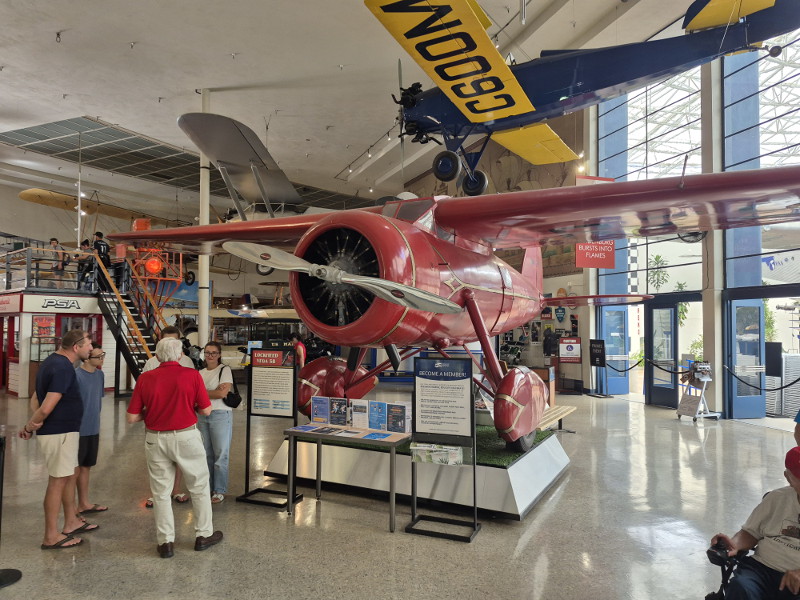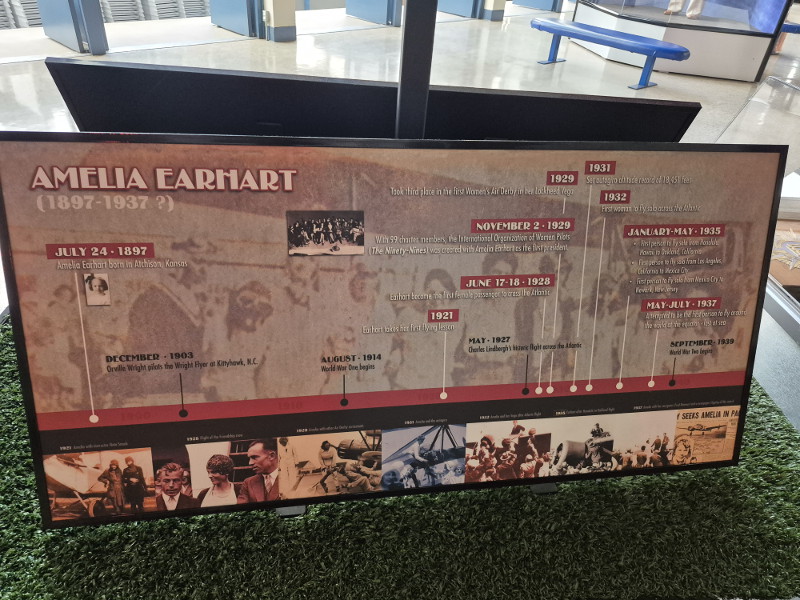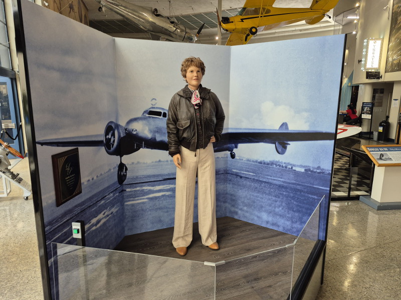 Visitors can listen to an animatronic Amelia Earhart talking about her life, and view a reproduction of a Lockheed Vega 5B, the type of aircraft she flew while setting many world records. The airplane in the museum was created for the Hollywood film Amelia.