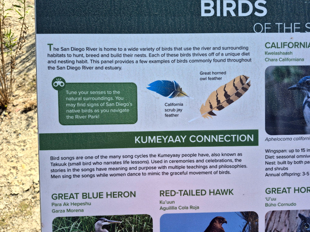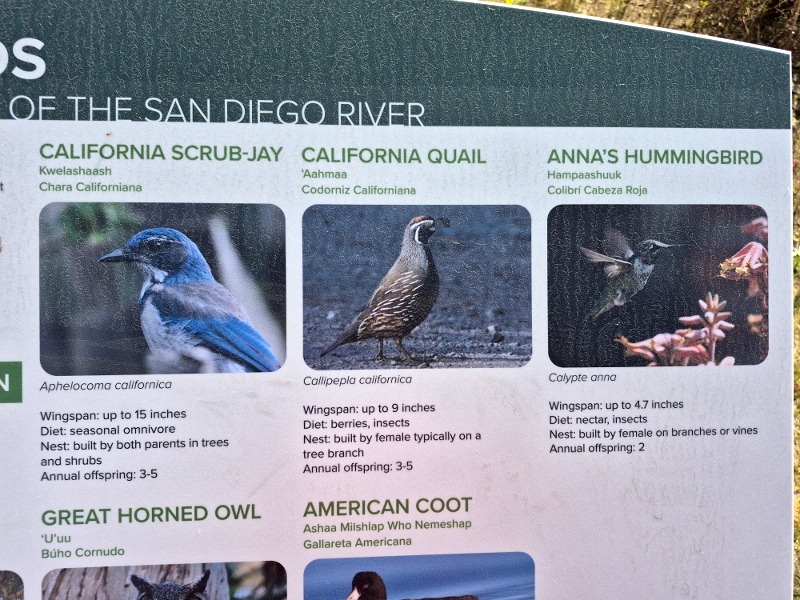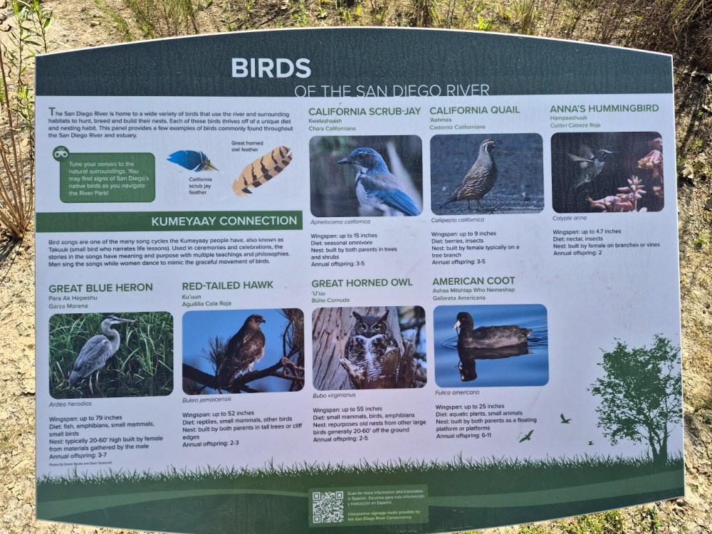Walking down one of the dirt paths off the main trail at the SDSU Mission Valley River Park, you might encounter this sign. It features birds you could see along the San Diego River.