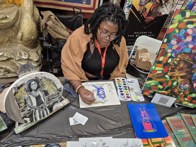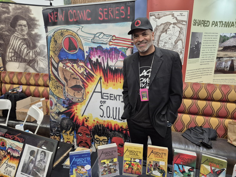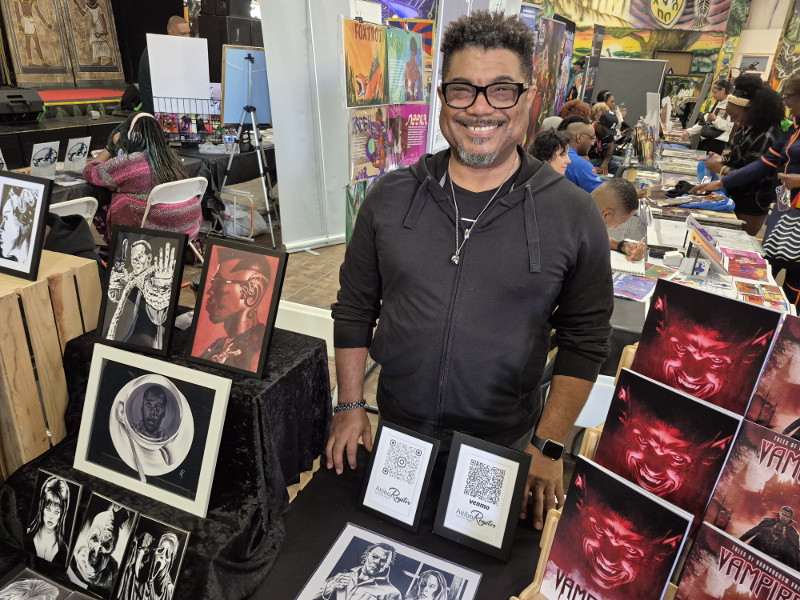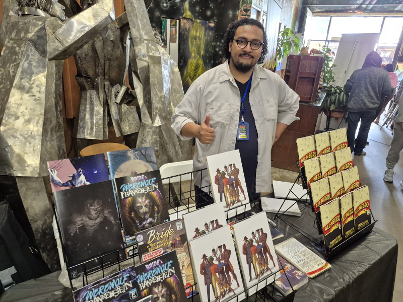 Defiant: The Story of Robert Smalls is the Civil War story of a man who escaped enslavement. He’d go on to make a huge impact on American history. There’s a graphic novel, and a major motion picture is in development! Click here.Buy some great books at this outdoor table and you’ll support the Malcolm X Library in Valencia Park!Derek Johnson wrote the noir supernatural horror The Caretaker. He’s a Las Vegas filmmaker and comic creator! Click here to support his work!Mike Haynes-Pitts created The Surge Series! It’s about Afrofuturistic, cyberpunk Africa hundreds of years in the future! His Instagram is here.Smiles at the Wingless Entertainment table. They publish comic books, coloring books and more cool stuff. Click here!The Agents of S.O.U.L. and creator David Phillips have many adventures! Check out the DP Comix website here.New Creation Comics is an independent Christian Publisher. Look at all the cool superhero-like covers! Their website is here.Vampires! Blade! Vampirella! Look at the cool pop culture images created by Attiba Royster at his website here!Bryttney-Mischele Salvant was creating a beautiful surreal expressionist piece at her table. To see more, visit her Poetic Artistry website here!More smiling creators! It’s cartoonist and printmaker Lyssette Williams, and Annika B., who wrote Current Objective and was busy creating a business card!What would happen if you turned the Frankenstein monster into a werewolf? To find the answer, check out this website by Eisner Award winning editor, writer and producer Chris Robinson!