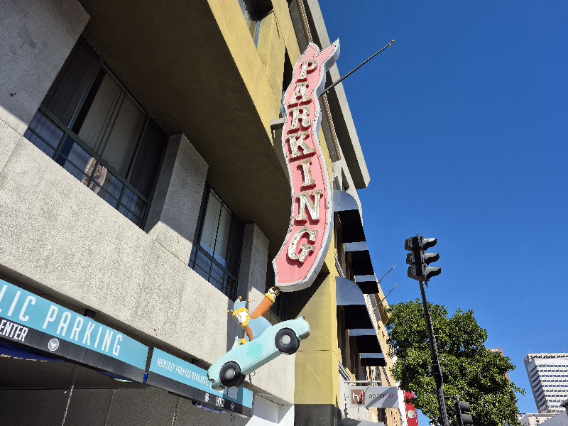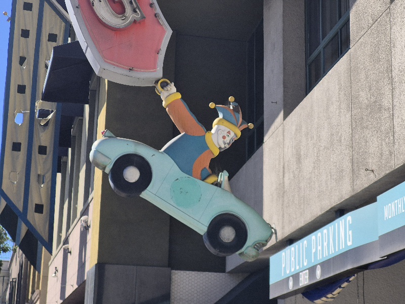 First is the F Street entrance sign for the old Horton Plaza parking structure. A playful jester welcomes motorists to what used to be a unique and very popular shopping mall!