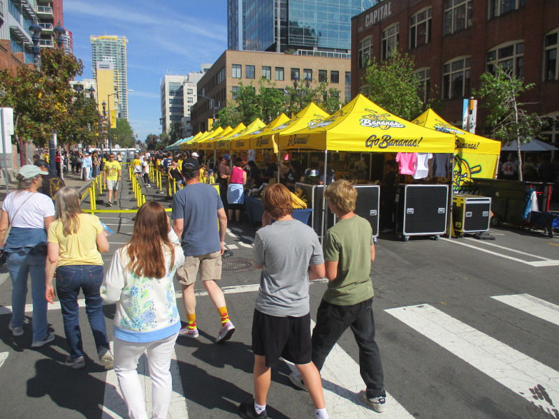 Both games this weekend are sold out. Today I walked through the festival atmosphere just north of Gallagher Square, where families (often clad in yellow) were lined up for fun banana ball merchandise.