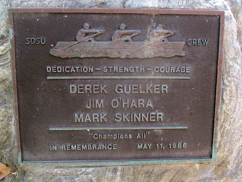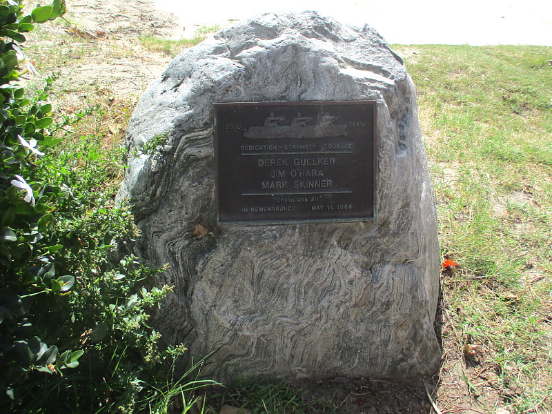 A plaque memorializes three San Diego State University rowers who perished in a tragic car crash in 1986.