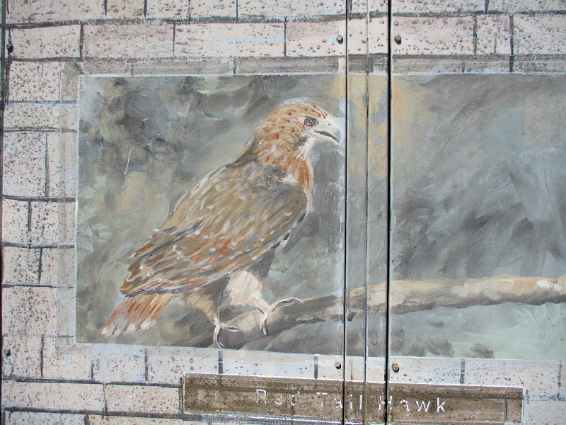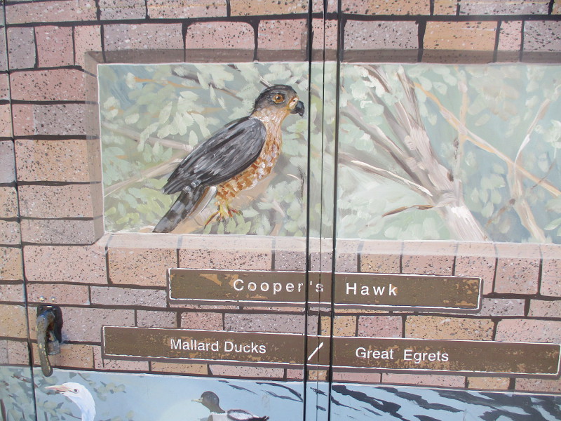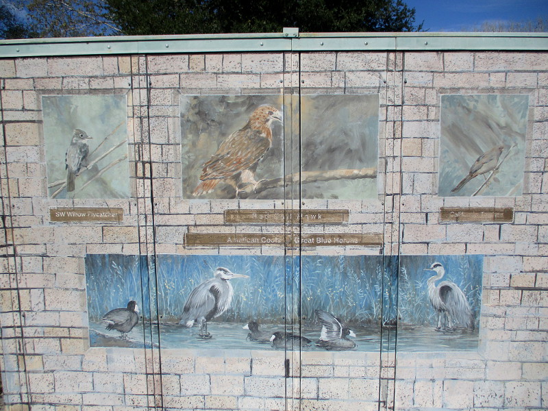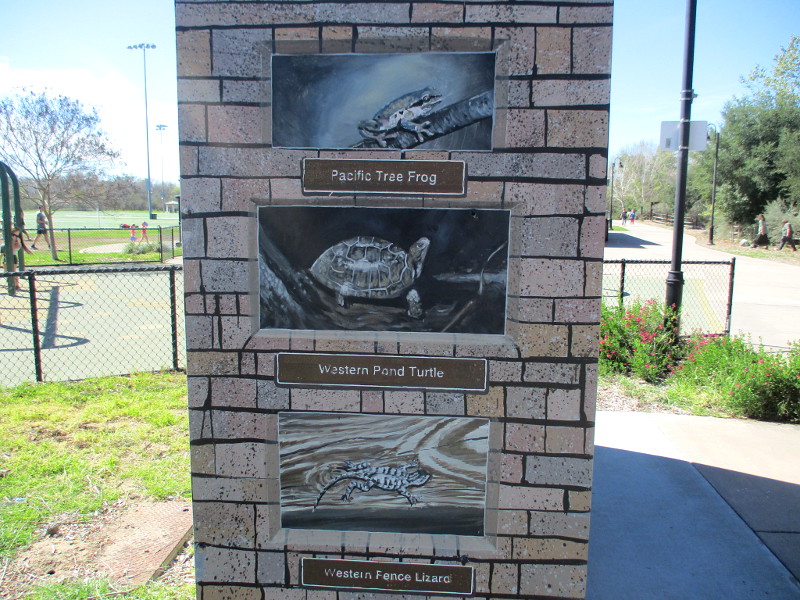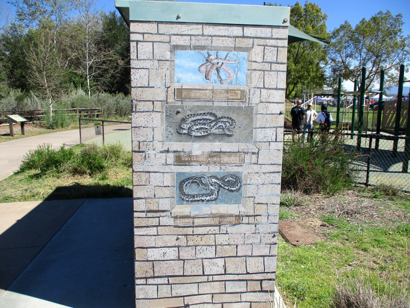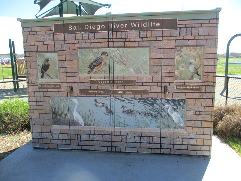On one side there’s a Cooper’s Hawk, Mallard Ducks, Great Egrets, Brown-headed Cowbird and California Gnatcatcher. On another side there’s a San Diego Gopher Snake, Two-striped Garter Snake and a third snake whose label has sadly become unreadable. A third side shows a Pacific Tree Frog, Western Pond Turtle and Western Fence Lizard. Finally, the side facing the playground shows a Red-Tailed Hawk, American Coots, Great Blue Herons, Southwestern Willow Flycatcher and California Towhee.