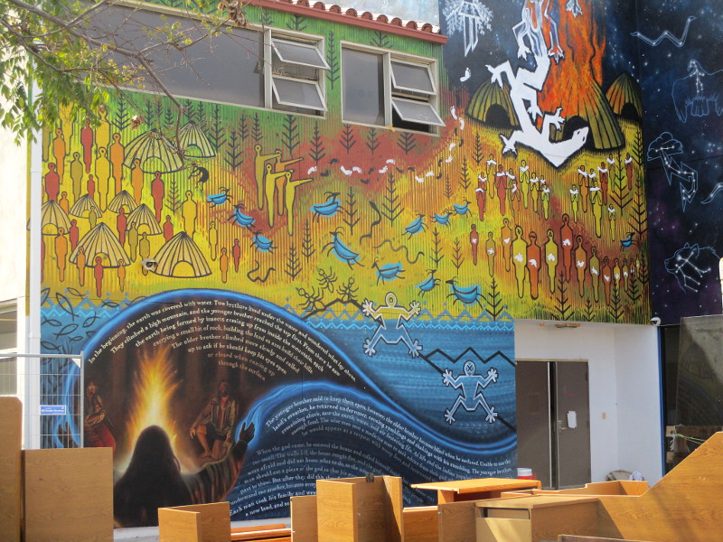 The mural tells a mythological story. It begins: