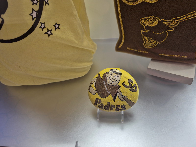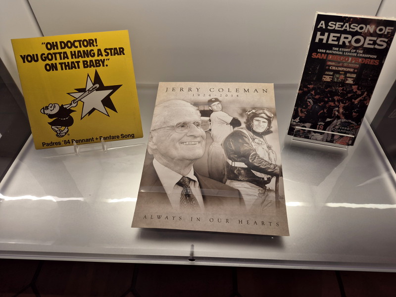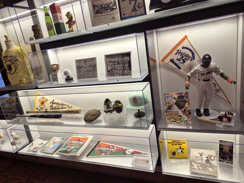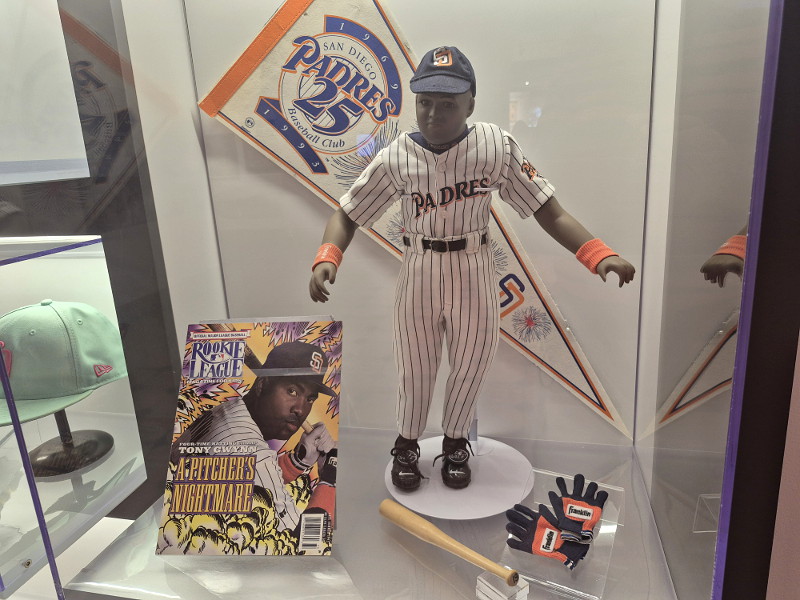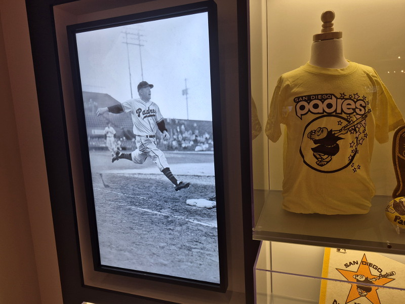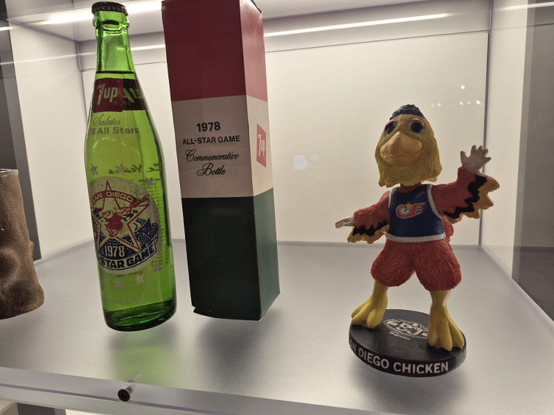 Artifacts and ephemera from the San Diego History Center’s collection are front and center. Most of the memorabilia on display concern the San Diego Padres and professional baseball in our city. Tony Gwynn, Jerry Coleman, the San Diego Chicken and others are lovingly remembered.