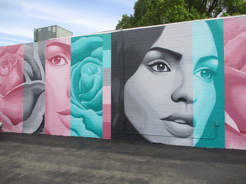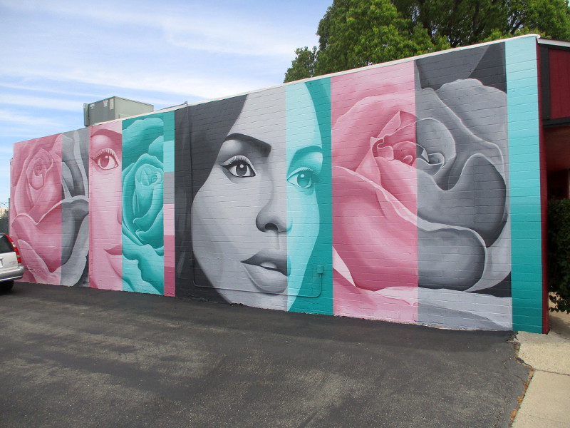 According to this article, the title of the art is Bellas Rosas. It was created by Charlie Mejia, teacher at Valley High School and member of the Escondido Mural Committee. The City of Escondido has been supporting the creation of public art as a catalyst for economic growth.