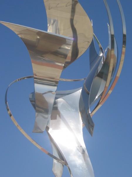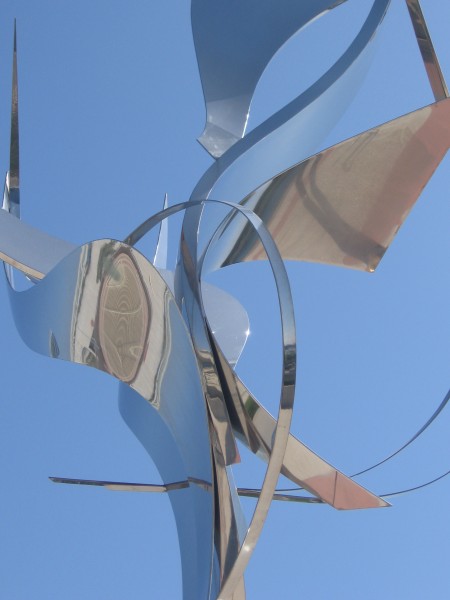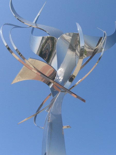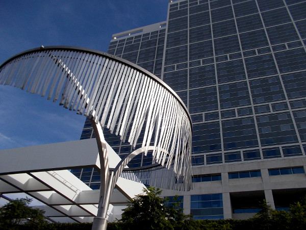 Light reflects from shining sculpture.Flame of Friendship from another angle.Cool sight at the San Diego Convention Center.Friendship between San Diego and Mexico.Sunlight glow behind silvery work of art.Tangled arcs of light in the San Diego sky.Flame of Friendship with hotels in background.