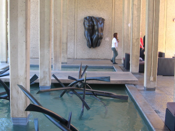 California Tower high in the blue sky behind unusual, thought-provoking art.Aim I, Alexander Liberman, 1980. Biased sliced aluminum tubes.Cubi XV, David Smith, 1964-64. Stainless steel.Two Lines Oblique: San Diego, George Rickey, 1993. Stainless steel.These interesting abstract sculptures are free to view in Balboa Park.Figure for Landscape, Barbara Hepworth, 1960. Bronze.Reclining Figure: Arch Leg, Henry Moore, 1969. Bronze.Peeking through one sculpture back across the lawn.Another view of the Sculpture Garden on a day with lots of people about. In this shallow pool is Accelerated Point, made of copper, by artist Claire Falkenstein.Turning to the north, we see more artwork in the Sculpture Court.Sonata Primitive, Saul L. Baizerman, 1940-48. Copper.The May S. Marcy Sculpture Court was dedicated in 1968.Man cleans small pool containing fascinating art.This sculpture is titled Night Presence II, 1976, by artist Louise Nevelson.The cafe in San Diego Museum of Art’s unique Sculpture Court.