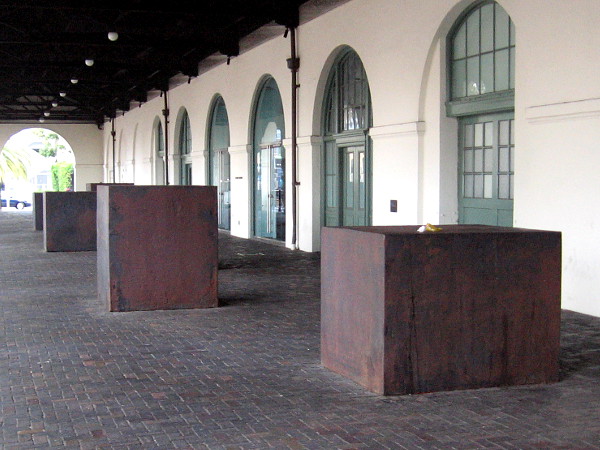 Six blue squares on the north side of the Columbia Place building.Steel cubes on west side of the Museum of Contemporary Art San Diego, which is housed in the Santa Fe Depot’s old baggage terminal. Art by Richard Serra, 2005. Litter atop cube 1 is by Anonymous. Idealized (though rusty) art meets messy (real) life.A crazy tangle of electrical lines in the entrance of the David C. Copley Building in downtown San Diego. A sculpture at MCASD. Power Maze with Sconce, Roman de Salvo, 1998.