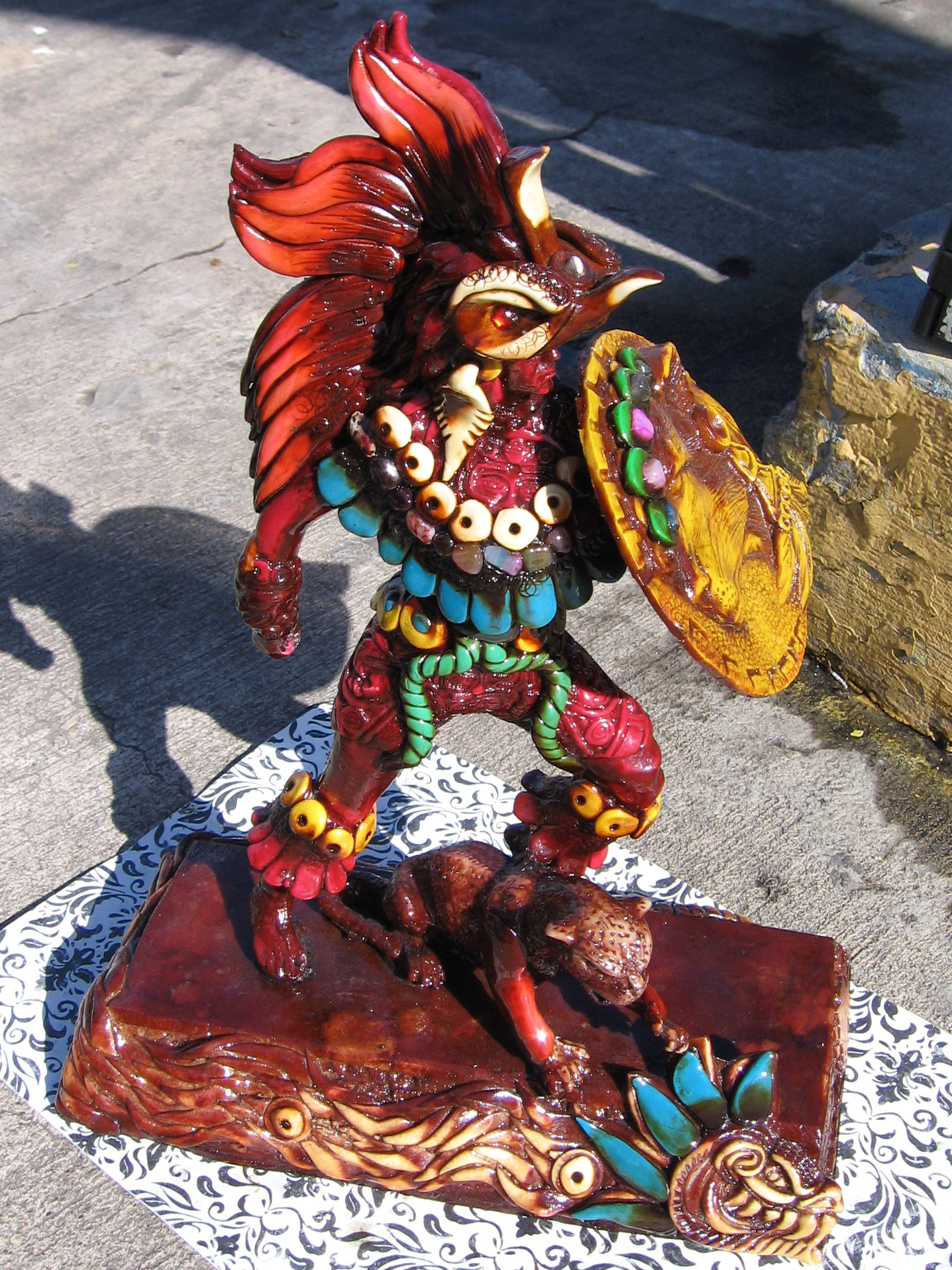 Close look at jaguar and serpent at foot of Aztec warrior, an amazing work of resin, acrylic and quartz by San Diego artist Carlos.