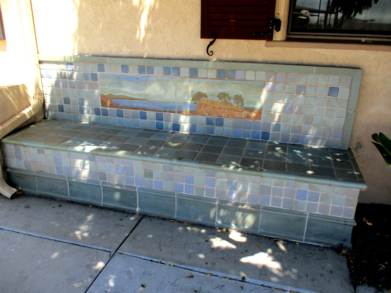 Very beautiful artwork can be seen just outside the entrance of the La Jolla Community Center. Tile panels on either side of the front door and tile work on a nearby bench depict La Jolla’s stunning coastal scenery.