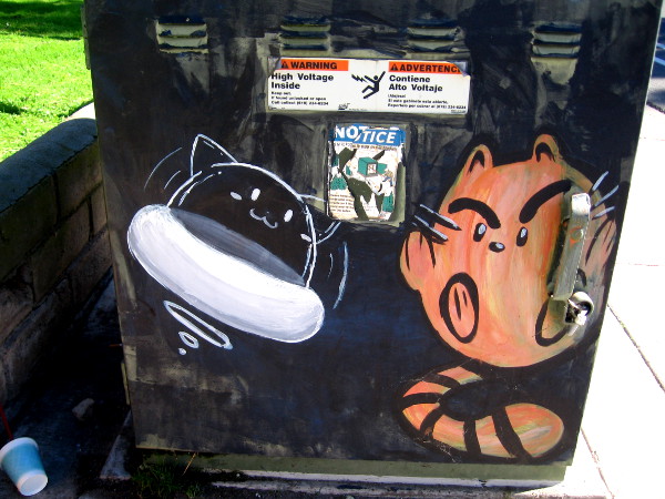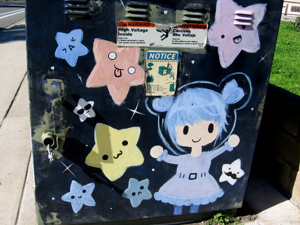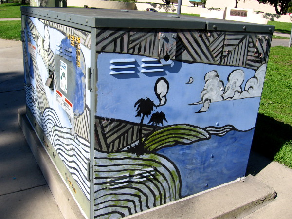 Lovely street art painted on a transformer box in Mira Mesa.A tree behind a white fence seems to bear pencils.Are mushrooms sprouting from the nearby grass?A seeming dream takes the form of mazy images. This street art is on a utility box near the intersection of Mira Mesa Boulevard and Camino Ruiz.Just a big heart and simple blocks of bright color.Looks like a Chargers bolt. Unfortunately, San Diego’s NFL football team bolted.One Love and many symbols atop a utility box in Mira Mesa.A painted Asian landscape. Mountains rise from turbulent water.Another side of the same dramatic box.A happy mug of coffee gives a wink near muffins, beneath musical notes.Happy food and drink!A happy face on a blue teacup!Kid with phonograph sits at base of a pagoda in this unique street art.A bunch of colored circles.A red, geometric, minimalist bit of street art.Colors pieced together like stained glass, and a rising koi on this utility box.Koi, water, sun and clouds.I can’t quite make out the beginning of what is written. I can read: Mira Mesa remain Strong, Brave and Proud!Two colorful electrical boxes along Mira Mesa Boulevard.Looks like a hip hop kid with a big funky cap.An old school phonograph!Looks like one of those trick squirting flowers.Two beautiful flowers.This puzzle-like street art looks both ancient and alien.A touching image of a young girl. She seems to sit alone on the sidewalk.Abstract hills, trees and blue beams of sunshine.More cool street art in Mira Mesa.A flying saucer cat and an orange tabby that doesn’t appear amused.A smiling girl astronaut among happy colorful stars.A dog in a space helmet joyfully rockets above a ringed planet.