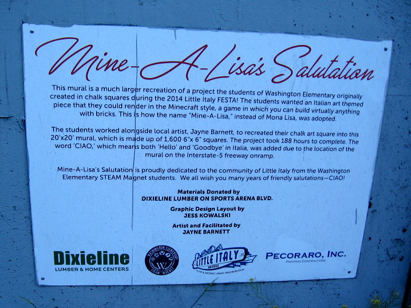 Mine-A-Lisa’s Salutation. The Little Italy mural is a much larger recreation of chalk art created by students at 2014 Festa. The Italian art-themed piece was rendered using “bricks” of color in the Minecraft style.Mona Lisa says goodbye to everyone with a large CIAO as drivers head onto southbound I-5 from Grape Street!
