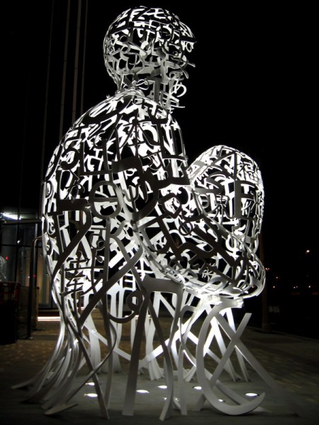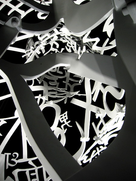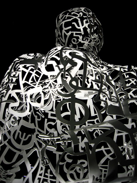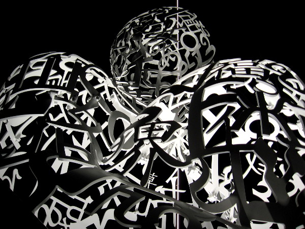 Early this morning, while it was still dark, I moved curiously around (and inside) the new Jaume Plensa sculpture Pacific Soul in downtown San Diego. Bright lights shining up from beneath the sculpture give its hollow but extremely complex form weird substance. Every angle fascinated my eyes.
