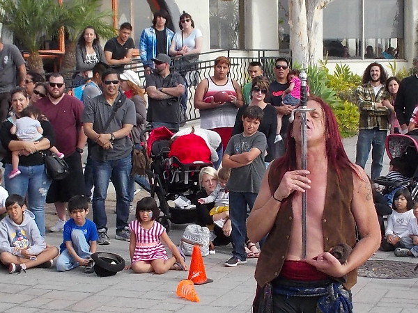 Even with the drizzly, breezy winter weather, people came out to Seaport Village on Saturday to watch some of the best street performers in the world.Daniel Israel juggles while high atop a unicycle!Cate Flaherty is a professional circus acrobat with a big smile. Her juggling and balancing performance was great!George Gilbert entertains people by the water. For a grand finale, he magically made a pineapple appear under his hat!Nolan Webster included a lot of humor in his parlor magic show. That ball was actually attached to his nose! Cheater!The audiences at the Busker Fest were all smiles.Kids seemed to have the best time while the buskers performed. Many adults were very shy.Murrugun the Mystic calls an audience together near Seaport Village’s central fountain before beginning his amazing two-part act!Murrugun’s first act is a series of fantastic fire breathing and eating tricks, including shooting flames out of his mouth! He performed to one side, out of the wind.The second act was sword swallowing. Murrugun the Mystic is one of very few true sword swallowers in the world.That’s a genuine, long and very sharp sword poised on Murrugun’s tongue.Here we go!When all the way in, the sword has penetrated between his heart and lungs and ends at the bottom of his stomach, just below the belly button!Next comes a sword sandwich–six swords carefully aligned together. Over the decades, a scary number of performers have died doing this dangerous sword swallowing trick. Murrugun himself was once seriously injured.That’s a lot of sharp steel to swallow!In go six genuine swords!One of the most amazing human spectacles you’re likely to ever witness!Back near the water, Jonathan Strange was doing some mystifying ring linking magic with an assistant chosen from the audience.Molly Keczan includes lasso rope tricks in her fun The Farmer’s Daughter Show.The Farmer’s Daughter keeps balance as she walks along the top of glass milk bottles–with one good eye! A wildly successful show, in spite of her contact lens difficulty!While walking around I spotted Martika Daniels setting up for her act with a big smile.Martika’s amazing show included being stood upon while lying on a bed of nails!Ouch! Martika explained that stunts like this make some of life’s difficulties seem small by comparison. Her show was super positive and inspirational!Another awesome sword swallowing act!Buskers and audience members all seemed to have a great time, even if the San Diego weather didn’t cooperate today!