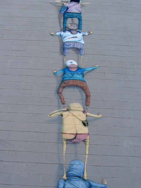 A shopper standing on the asphalt braces against a Horton Plaza parking lot wall. Others have climbed up onto her shoulders.People mount higher and higher like circus performers, trying to get a glimpse over the wall. Something wonderful must await on the other side!This stack of humanity is beginning to resemble the Tower of Babel. I hope they don’t fall!Don’t believe the hype! That’s some mighty tall street art!