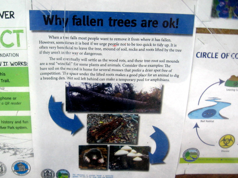 One of hundreds of trees that were uprooted during the super violent microburst last September. Amazingly, this one still flourishes!This fallen tree is now growing horizontally like a hedge along a Mission Valley sidewalk!Sign beside the San Diego River Trail. Why fallen trees are okay! There are important benefits to the soil, flora and fauna.