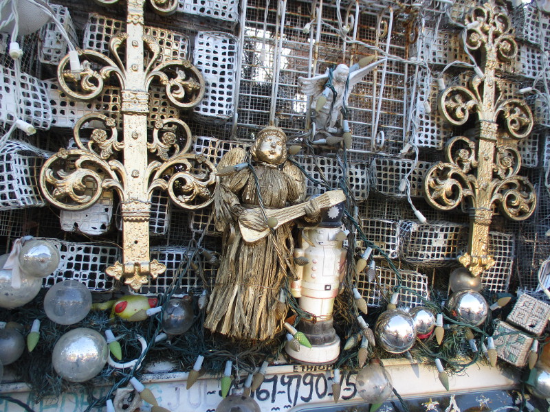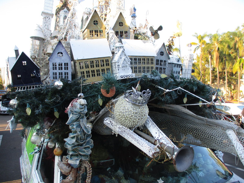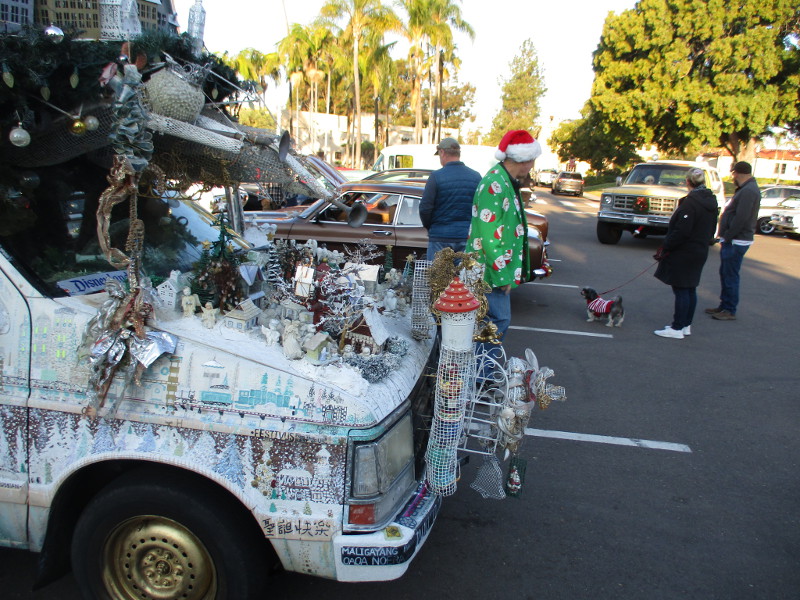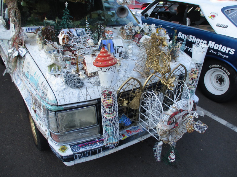 During Deck the Cars, a crowd of car enthusiasts converged to admire the Christmas Imaginarium Carriage, which, like a mobile work of art, is decorated with angels, nutcrackers, Santas, small houses and buildings, Christmas trees, lights, ornaments, and painted winter holiday scenes.