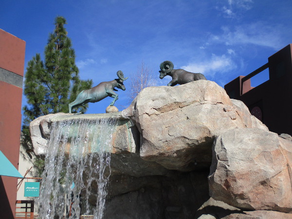 The wildlife sculptures are found throughout the mall, among trees, on pedestrian walkways, even lurking atop artificial rocks and waterfalls. Families turning corners might encounter a bear, mule deer, mountain lions, a rattlesnake, coyote, river otter, Canada geese, and even desert bighorn sheep. Adult animals are often accompanied by their young. The bronze sculptures depict the animals interacting with each other naturally in their small realistic settings.