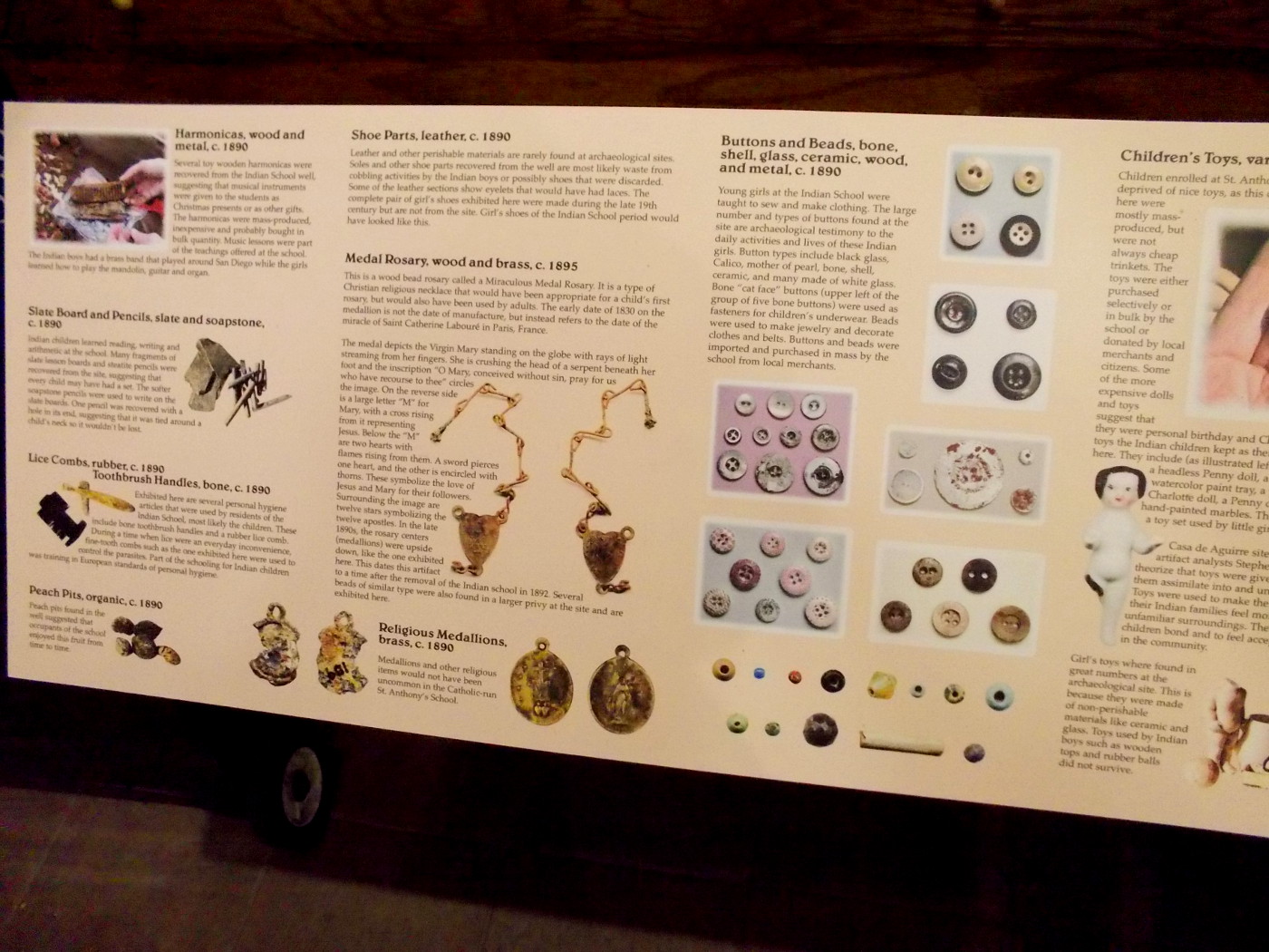 Casa de Aguirre in Old Town was originally built around 1853. The adobe mansion was one of the first houses in San Diego, owned by Don Jose Antonio Aguirre, a prosperous merchant and rancher. The present building is a reproduction.Bronze bust of Don Jose Antonio Aguirre, near entrance to Casa de Aguirre. Born in Spain, he owned several ships and warehouses and imported goods from Peru and China to trade for cowhides and tallow.Don Jose Antonio Aguirre was known for his charity and funded many projects in early San Diego. He, his wife and children are considered to be one of our city’s founding families.Bust of Father Antonio Ubach, Last of the Padres, 1835-1907. Antonio Dominic Ubach ran St. Anthony’s Indian School on this site from 1886 to 1891.Plaque describes how Father Ubach advocated for California’s Native Americans and lobbied government to protect the Indians and their lands. He was loved by many. His last words were: “Have charity.”Casa de Aguirre in Old Town San Diego today contains a shop visited by many tourists and a small museum in back.One side of El Museo Casa de Aguirre. Excavated artifacts are on display, recalling what life was like here in the mid to late 19th century.Visitor to the small museum watches a video which includes information about archaeological discoveries, the history of the casa and the lives of those who were sheltered here.St. Anthony’s Indian School Artifacts Tell a Story. Many objects on display include porcelain cups, goblets, bottles, a saltshaker and beer mug.Sign describes additional historical finds, including buttons, toys, harmonicas, slate board and pencils, lice combs, toothbrush handles, shoe parts, medal rosary and religious medallions.Marbles, doll parts and tiny children’s tea sets, recovered from San Diego’s past.Dozens of buttons on display. They were fastened by living fingers, now long gone.Two old pipes.Numerous bottles and jars are exhibited in the Casa de Aguirre Museum. They were used for medicine, mustard, chemicals, perfume, whiskey, beer, sarsaparilla…People interested in collecting antique bottles would be mesmerized by the large assortment on display.Don Antonio and Rosario Aguirre in Old Town History. The museum is located in what was once the bedroom and servants quarters in the Casa de Aguirre. The present-day adobe is a reproduction.Don Antonio Aguirre, 1799-1860, was one of San Diego’s most important figures back when our burgeoning Southern California city was just a very, very small town.A model of how the Casa de Aguirre appeared a century and a half ago.