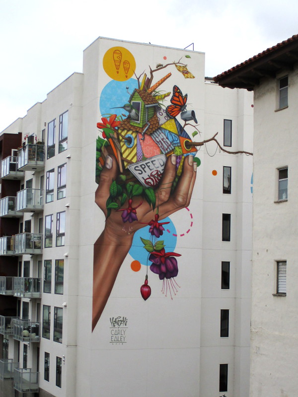 Two colorful murals in East Village promote riding bicycles and scooters. They’re painted on the north side of the old Farkas Store Fixtures building, on G Street between Ninth and Tenth Avenue.