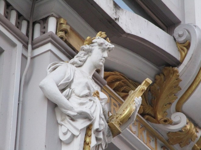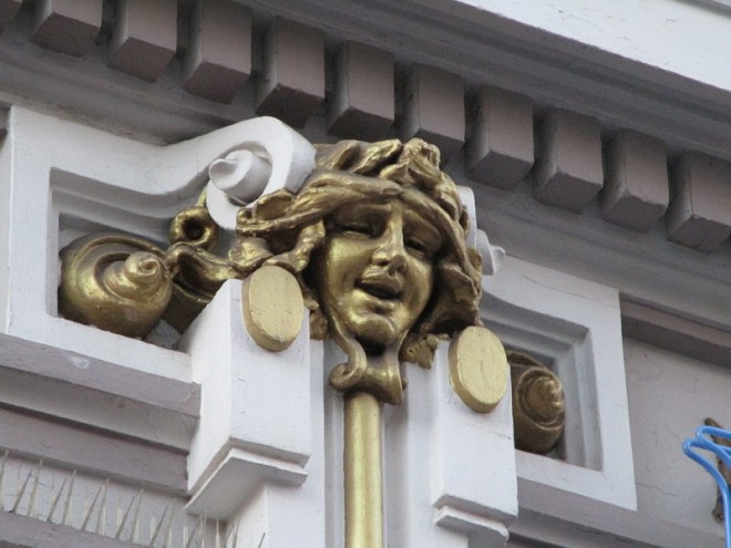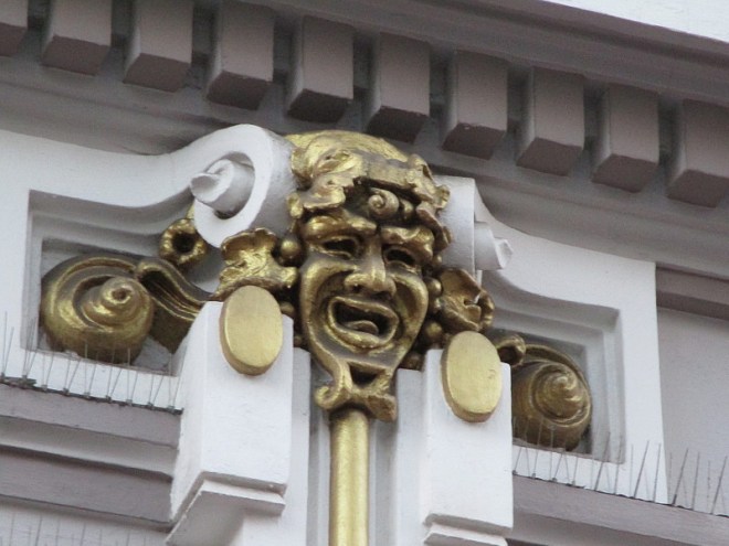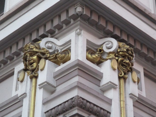 Two of the face types, which can be found at intervals around the building, look like dramatic golden masks. The other two belong to musicians holding a lyre and harp, directly above the marquee.