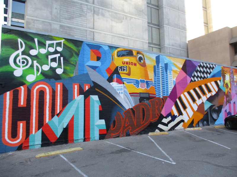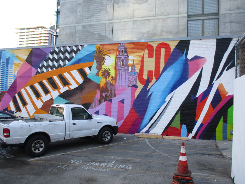 The colorful artwork appears to celebrate San Diego’s Columbia District, with musical notes from the nearby Music Box, a train (Santa Fe Depot), a cruise ship and distinctive Emerald Plaza. But I’m not certain. Because I also see an image of Balboa Park’s distant California Tower and part of the Padres logo.