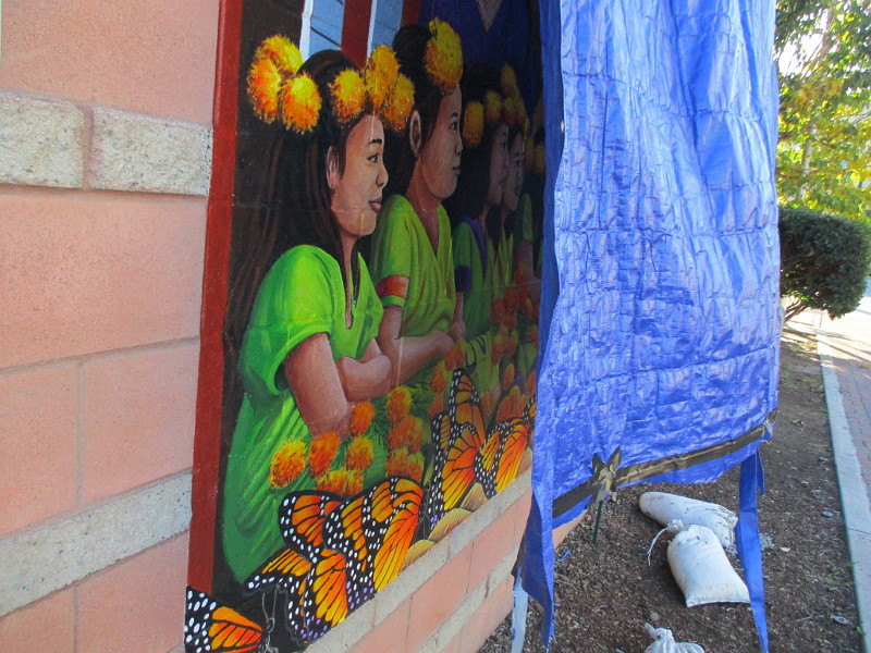 I was walking through National City yesterday when I noticed a blue tarp flapping in the wind on the wall. Bright color was peeking out from one corner!