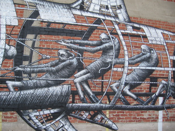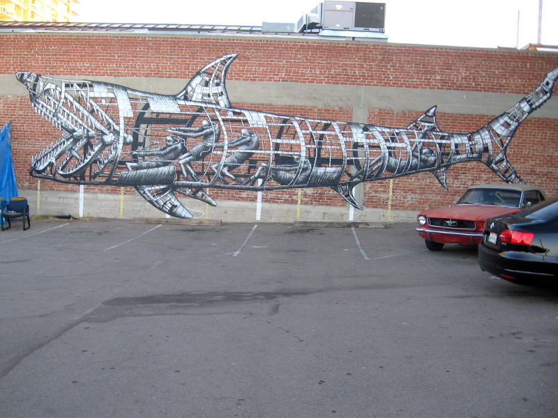 Street artist Phlegm painted this unusual shark for PangeaSeed’s Sea Walls: Murals for Oceans.Shadowy, mysterious people secretly operate the black and white mechanical shark.Phlegm often paints masked figures controlling odd contraptions in this illustrative style.