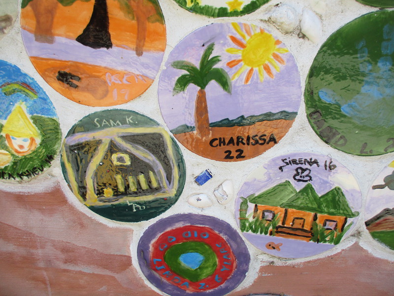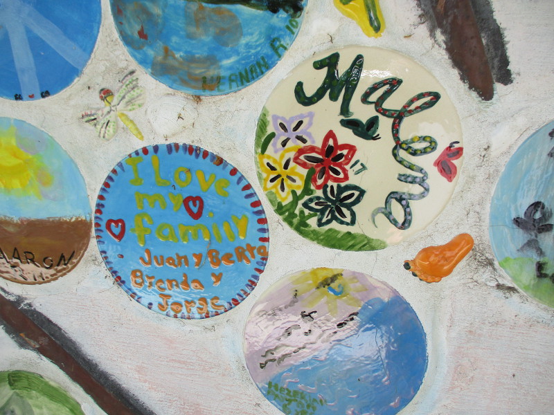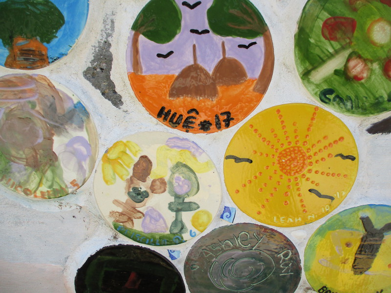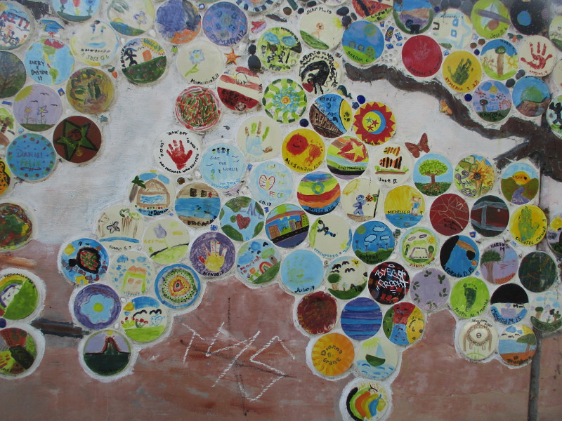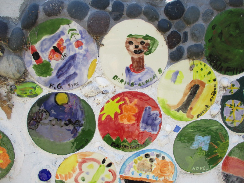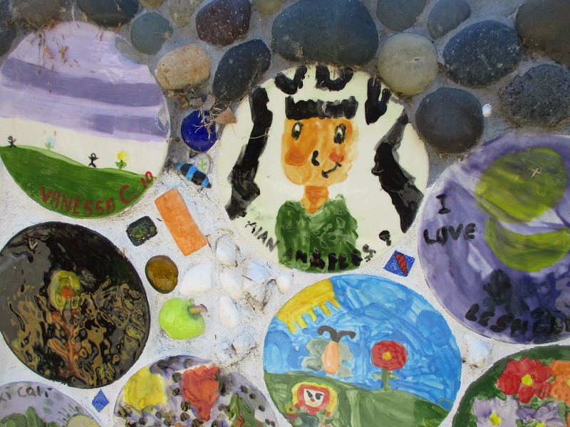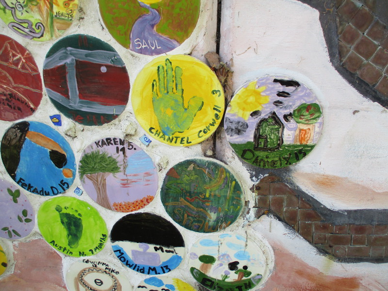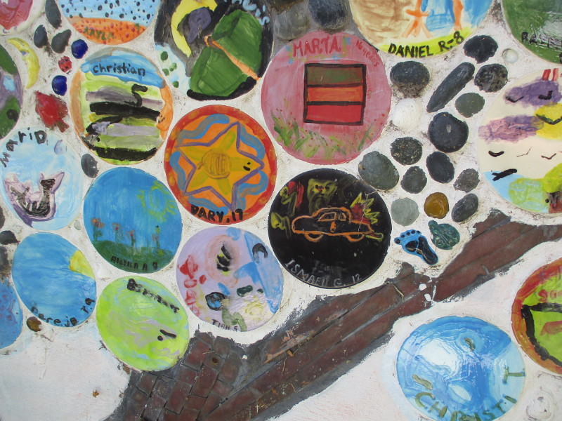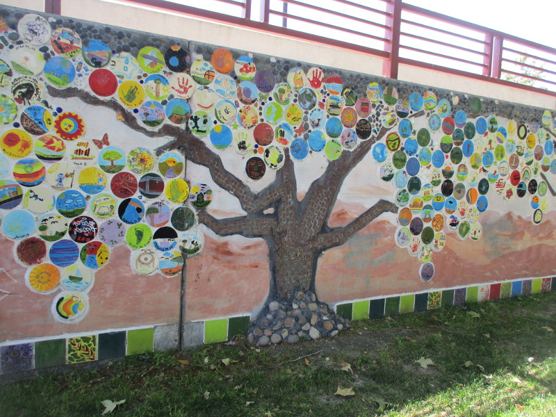 On the left wall of the Market Creek Plaza Amphitheater one might notice scattered colorful disks. This is just a small part of the Children’s Wall. Turn a corner and you’ll discover a copper-inlaid tree surrounded by circular ceramic leaves painted by more than 600 local children!