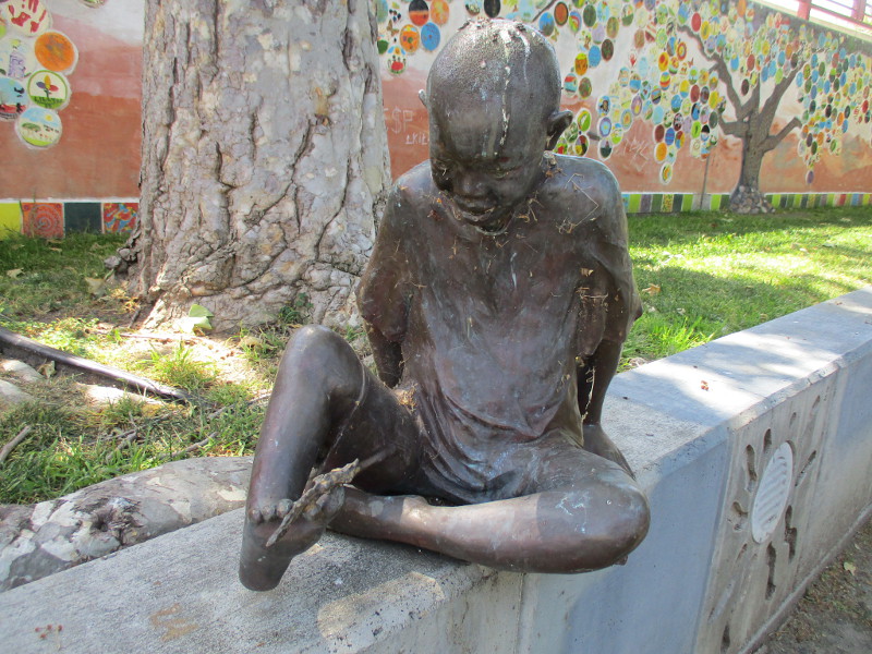 And perched before it, in the shade of trees lining Chollas Creek, by a patch of green grass, you’ll encounter a child with a dragonfly in his toes. The very fine bronze sculpture is titled Dragonfly Dreams, and it was created by local artist Jean Cornwell Wheat.