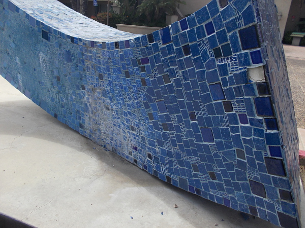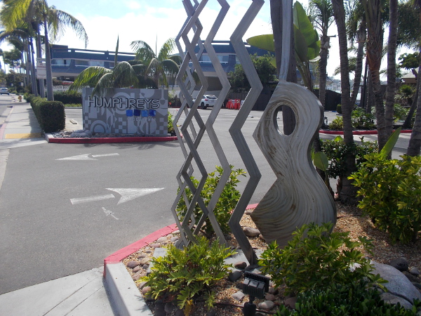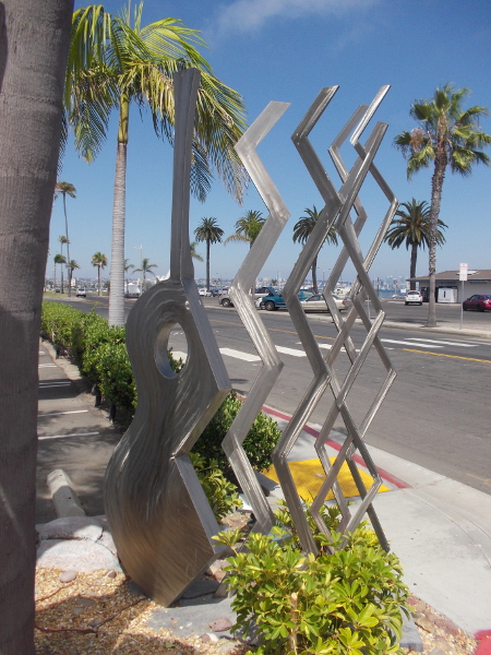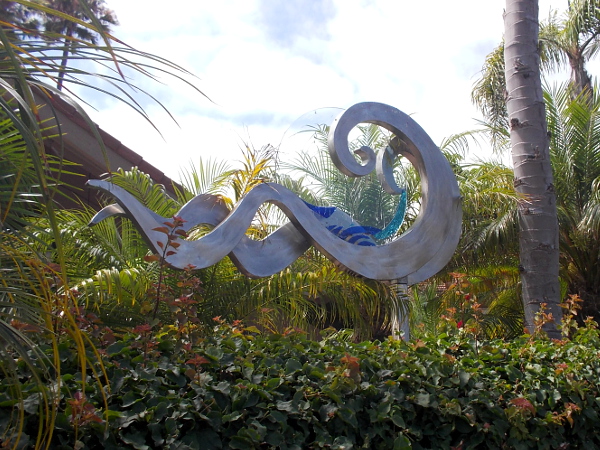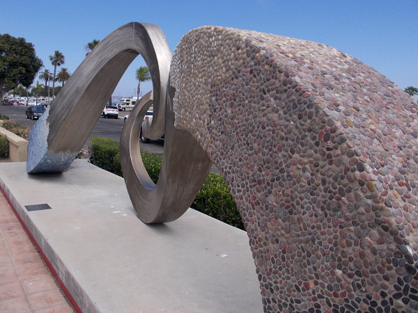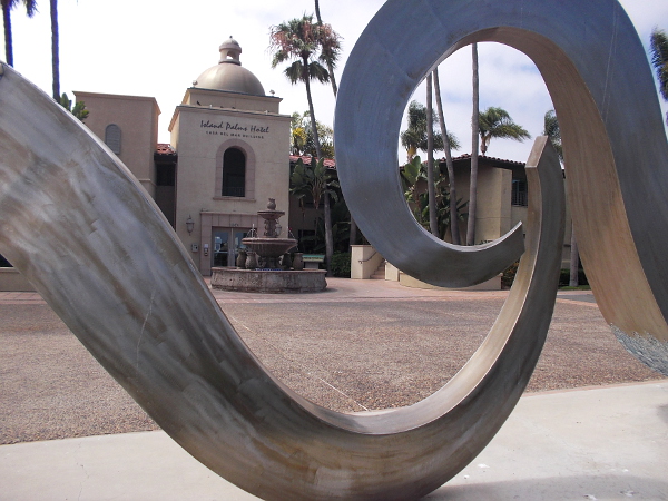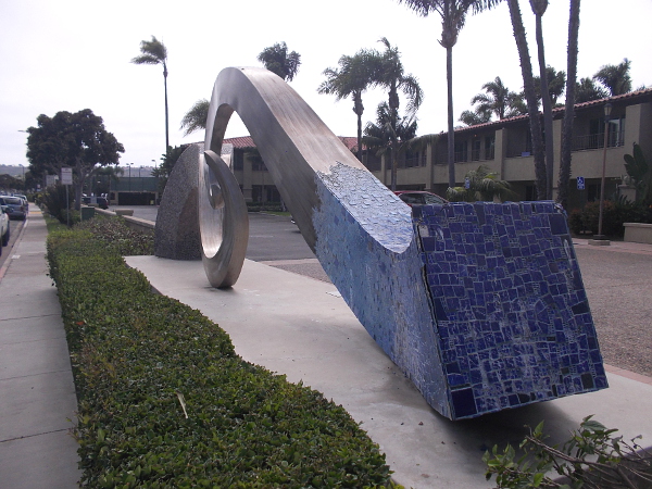 Like a blue wave curling in to the earthy shore, the graceful artwork stands between Shelter Island Drive and a hotel parking lot, directly in front of the Island Palms Hotel’s Casa Del Mar Building. It was dedicated June 2009.