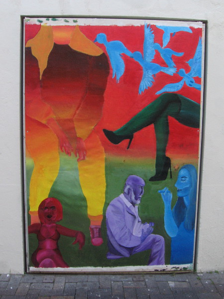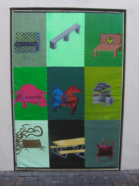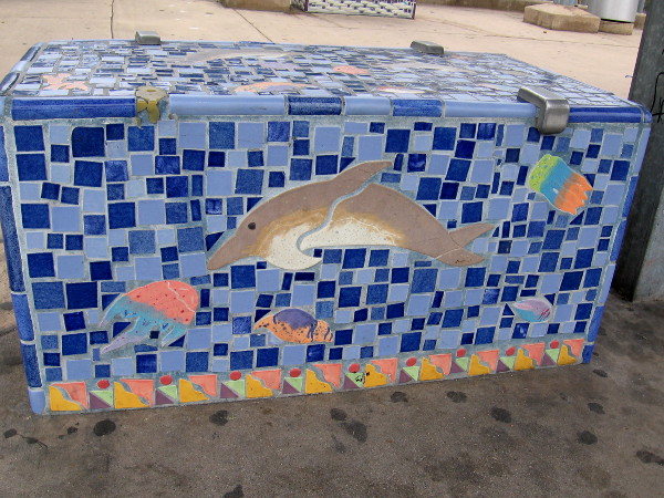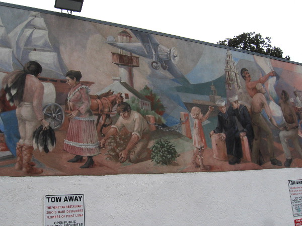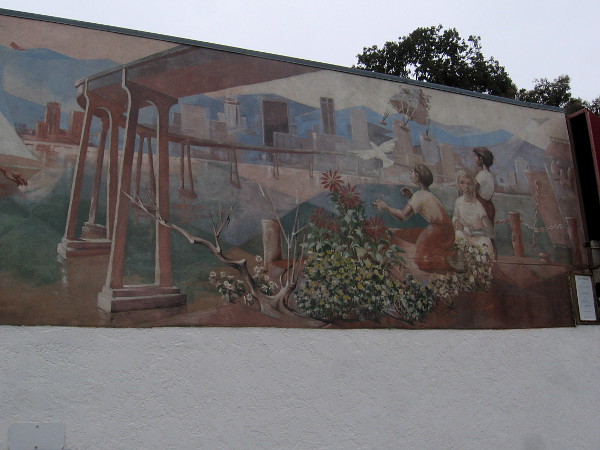 I walked down a sidewalk past the three murals recently and took close-up photos that you might enjoy. I saw some faded writing at the corner of one, but I’m afraid I can’t say for certain who the artist is or how long ago these were painted. I probably should’ve visited the self storage office and asked whether they know. If someone out there has any information, feel free to leave a comment!