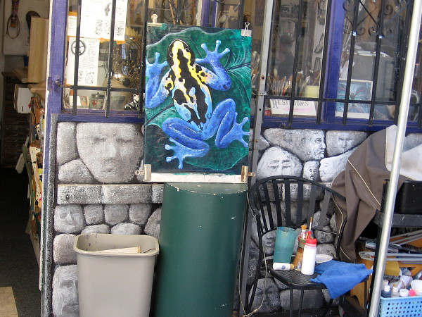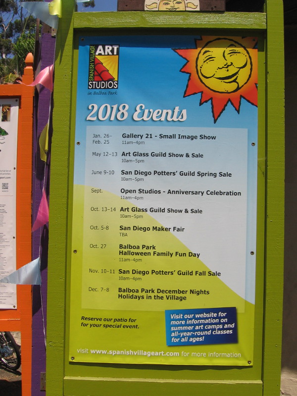Sign lists 2018 events, including special shows and sales, in Spanish Village Art Studios in Balboa Park.Patio tiles leading visitors to the front door of Studio 26 seem like a Yellow Brick Road of many colors.Surprising colors grow in four pots.The rear of the Uni-two-corn by sculptor Kim Ogburn, which functions as a seat for two.A dreamlike canvas in front of Studio 31 in Spanish Village.Someone admires a glass vase created by the friendly glassblowers in Studio 19.Beautiful cacti in a planter near the front door of Studio 18.An amazing flower outside the San Diego Mineral and Gem Society building in Spanish Village.Colorful cats have gathered on the patio in front of Studio 16 in Spanish Village.The local artists in Studio 14 specialize in Kaleidoscopes, Egg Art and Handmade Art.A painter creates new artwork outside the window of the Southwestern Artists’ Association Gallery in Studio 23.Mary-Ella Bowles in Studio 6 created this fun Fairy House out of a gigantic hollow gourd!A colorful frog is standing on a big leaf outside Studio 10.