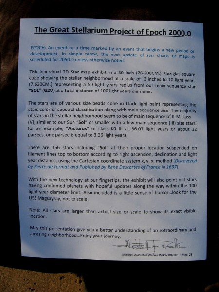 The impressive 30-inch Stellarium that debuted today displays our “stellar neighborhood” within 50 light years of Sol, the sun. Our tiny corner of the galaxy took Mitchell a little over a year to build. The 166 stars are obviously not to scale, but the distances between them and their relative positions around Sol are accurate. Each tiny star, attached to a filament that is almost invisible, shines with fluorescent paint in the color that matches its spectral classification. In darkness, under the cube’s black light, the effect is extraordinary.