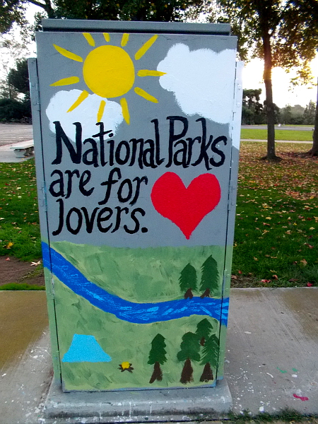 I spotted this happy street art while walking up Sixth Avenue, along the west edge of Balboa Park. An electrical box was recently painted. It shows a wilderness scene with the words: National Parks Are For Lovers.