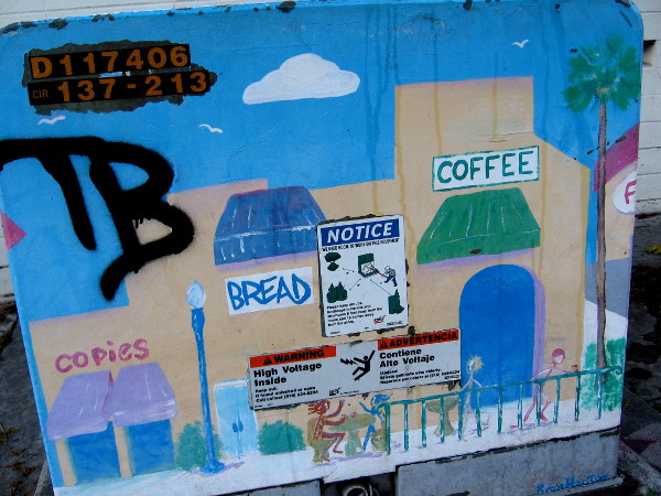 A funny spotted creature of some kind decorates an electrical box on Fourth Avenue near the Quince Street Bridge.