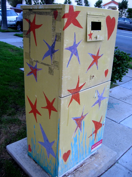A guitar and stars decorate a utility box.Colorful art shows a street scene! Copies, bread, coffee and outdoor diners come together under a blue sky near Fourth Avenue and Laurel Street.Ice cream, barber, eyes, dentist. A happy stick figure walks down an imaginary Bankers Hill sidewalk.A contented face on a utility box near the intersection of Fourth Avenue and Laurel Street.Lots of stars and some hearts.According to some writing on this transformer, these are space plants and moon flowers!