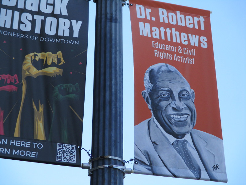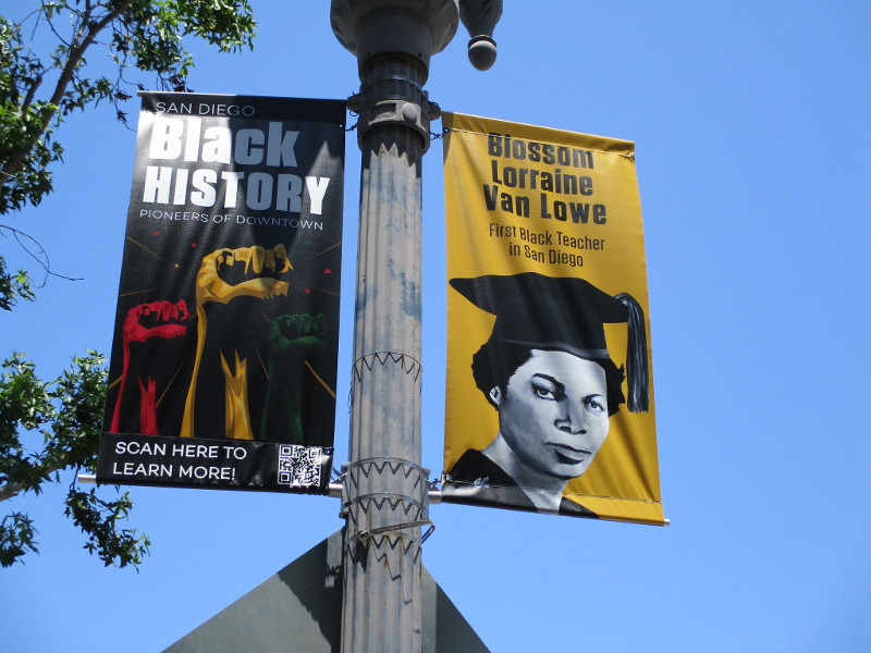 A series of street lamp banners celebrating Black History in San Diego can be observed on Market Street, between Sixth Avenue and Tenth Avenue. Depicted are eight notable pioneers of downtown!