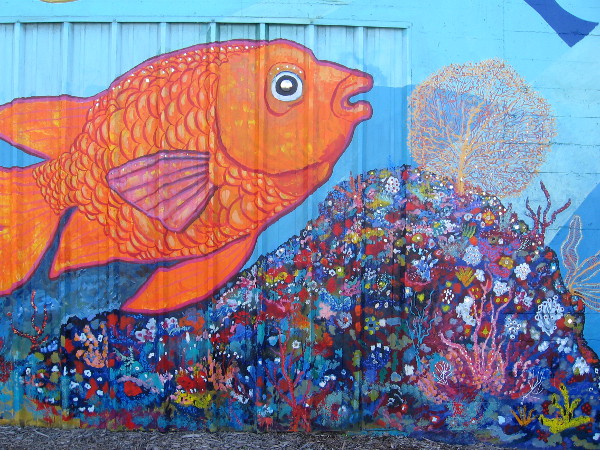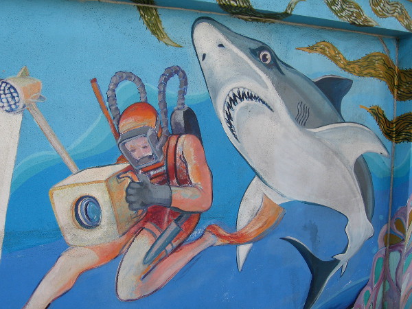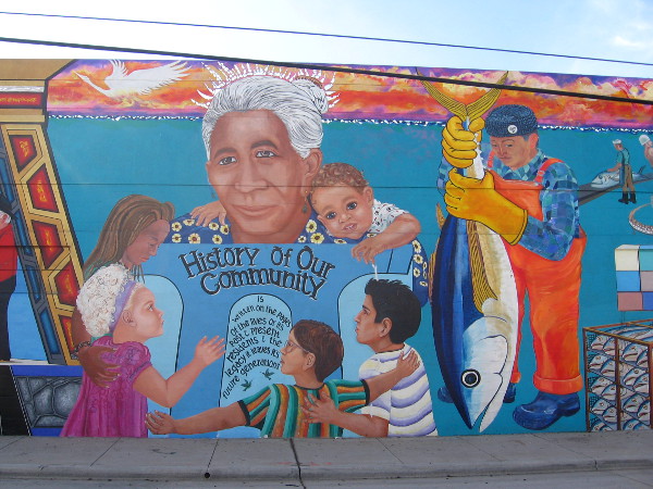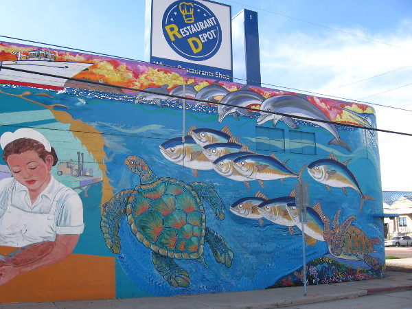 Long wall along Harbor Drive is the canvas for this very large street mural.Proximity to San Diego Bay inspires painted marine animals.This big fish seems to be watching for pedestrians on the Barrio Logan sidewalk.A scuba diver seems unaware a large hungry shark looms just behind!Mother with young child gazes out at the blue Pacific Ocean.People from all walks of life populate this very human work of art.San Diego Trolley travels through a scene similar to those found in nearby Chicano Park.Painted passengers on a trolley seem visible through a window.Aztec warrior in elaborate costume blows on a ceremonial conch.Nearby Chicano Park’s pavilion is shown with lots of folks dancing.Young man and lady dance on the festive outdoor mural.Musicians play instruments adding flavor to the celebration.History of Our Community includes the once vital tuna fishing industry.The lives of past and present residents provide generations of stories.Fish caught in local waters just off San Diego.The end of Harbor Drive section, and now we’ll turn west for a bit more…Walking around the mural on the high wall at Restaurant Depot.This north-facing wall contains lots of bright aquatic life!Beautifully painted fish, a seahorse, jellyfish and starfish.An orange Garibaldi just above the sparkling ocean bottom.Kelp frames the end of this long, amazing mural in Barrio Logan.This super fun street art is a landmark that is very hard to miss!