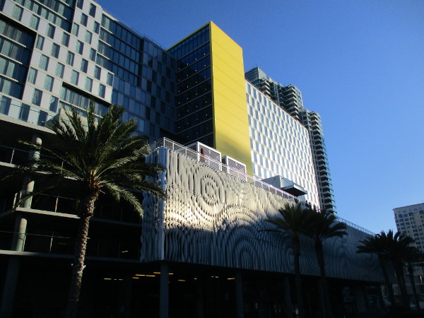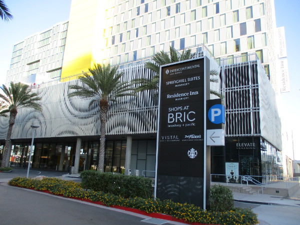 If you’re curious about the rippling façade you see above and in several other photographs, it covers the Marriott building’s parking garage and is titled California Rain. The sculptural artwork was created by artist David Franklin. I posted photos almost five years ago here. (Read that blog post’s comments to learn more about how the individual aluminum blades were assembled!)