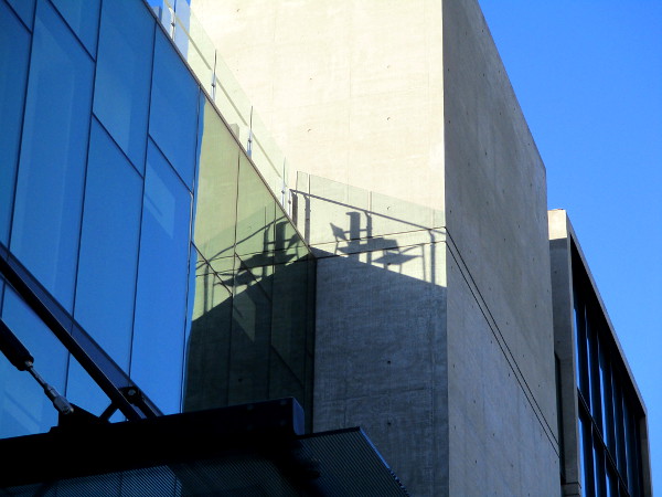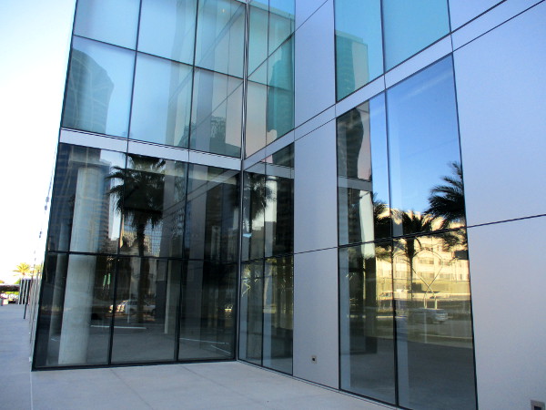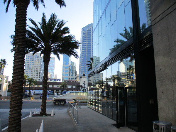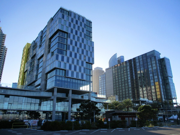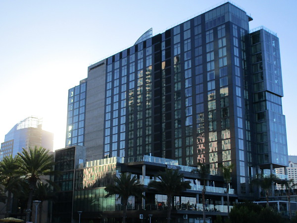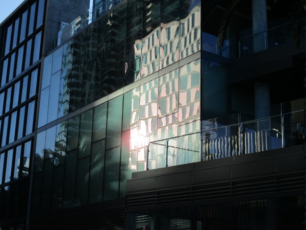 Bright, clear light reflected from the two very different buildings: the InterContinental San Diego building and the Marriott SpringHill Suites and Residence Inn building across from it. Perfect for intriguing photos!